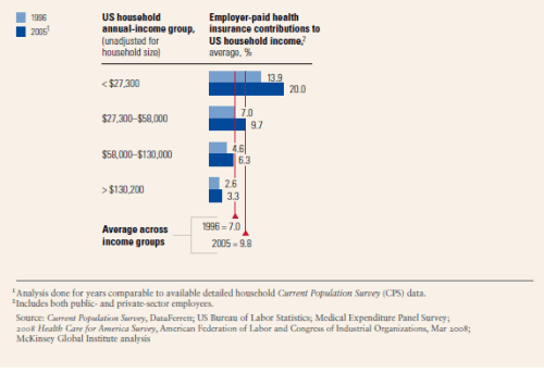 “In 2005, employer-paid health benefits covered 22 percent of households in the bottom-income group, contrasted with 56 percent of the lower-middle, 81 percent of the upper-middle, and 89 percent of the top income group”