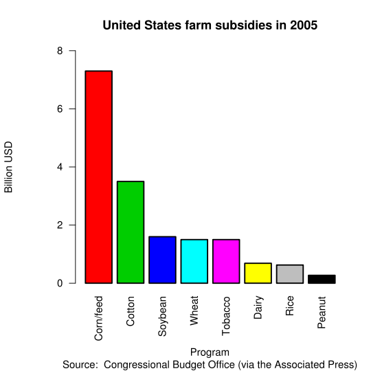 The U.S. Agricultural Department is required by law (various U.S. farm bills which are passed every few years) to subsidize over two dozen commodities. Between 1996 and 2002, an average of $16 billion/year was paid by programs authorized by various U.S. farm billsdating back to the Agricultural Adjustment Act of 1933, the Agricultural Act of 1949, and theCommodity Credit Corporation (created in 1933), among others.