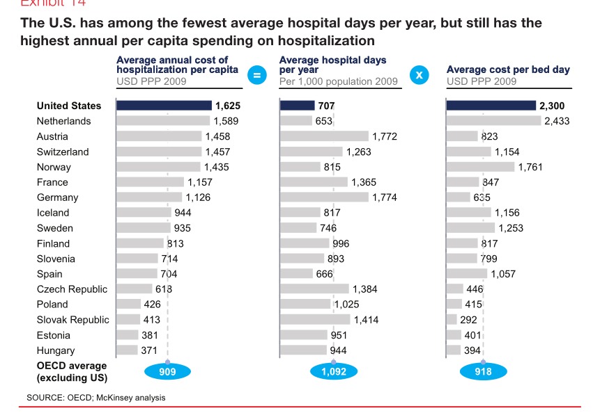 Despite the “slowdown” our costs/capita for health care remain by far the highest in world. For example hospital costs, even with the decreased “utilization:”