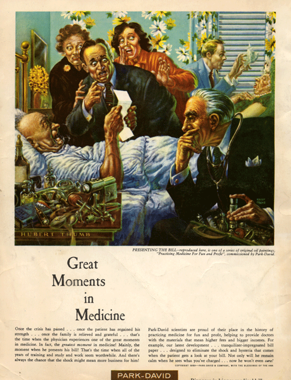 Mad Magazine famously pointed out the inflation in medical costs in the late 60’s with a parody on ads by Parke Davis (By Ken Freas).