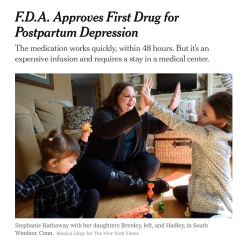 “The first drug for women suffering postpartum depression received federal approval on Tuesday, a move likely to pave the way for a wave of treatments to address a debilitating condition that is the most common complication of pregnancy.”