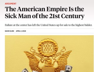 “Trump’s administration is openly bought by foreign governments via his international network of hotels and resorts, including the one located directly between the White House and the U.S. Capitol, where a Saudi-funded lobbyist rented 500 rooms in the month after the 2016 election. His political party, which still controls the Senate and increasingly dominates the judiciary, has no interest in holding him accountable for any of this. And of course there’s the small matter of Russian interference in the 2016 election; as the limited information known so far from special counsel Robert Mueller’s report confirms, Trump and the Republicans were at the very least the passive and willing beneficiaries of efforts by a foreign power to influence the election outcome.”