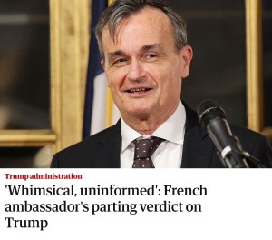 “The outgoing French ambassador to the US has compared the Trump administration to the court of King Louis XIV, filled with courtiers trying to interpret the caprices of a “whimsical, unpredictable, uninformed” leader.”