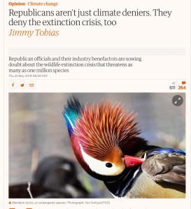 “Now, it appears, prominent Republican officials and their industry benefactors are using the same bankrupt strategy to sow doubt about the wildlife extinction crisis that threatens the continued existence of as many as one million species across the globe. The Republican elites are not just climate deniers – they are extinction deniers too.”
