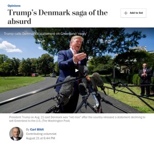 “Canceling visits now seems to be what remains of Arctic policy for the United States. Perhaps just as well. All other countries are keen to try to prevent Greenland from turning green again. We would all suffer the consequences.”