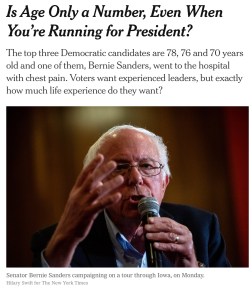 Medicynical note: Bernie is an exceptionally vigorous 78 year old. His run for the presidency has been filled with all manner of promises, unrealistic but attractive, that have captured the imagination of many who haven’t bothered to calculate the costs. He now has little or no chance for the nomination. He represented Trump’s best chance for re-election. The same might also be said for Elizabeth Warren whose plans also seem as pie in the sky and unrealistic as Bernie’s–maybe a tad closer to reality. But IMHO they don’t pass the smell test. Meanwhile Biden, undeniably a nice guy with a sap sucking son bumbles along. And Trump at age 73 continues to play his role of ultra-conservative delusional, pseudo-religionist, misogynist with large intellectual deficits that he tries to cover-up with aggression and juvenile nastiness.