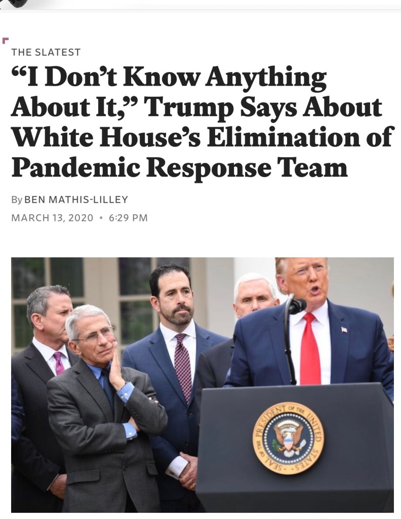 TRUMP: Well, I just thank it’s a nasty question, because what we’ve done, and Tony had said numerous times that we saved thousands of lives because of the quick closing. [Ed.: The closing of borders to some travelers.] And when you say me, I didn’t do it. We have a group of people, I could ask perhaps, in my administration, but I could perhaps ask Tony about that, because I don’t know anything about it. I mean, you say we did that, I don’t know anything about it. Disbanding, no, I don’t know anything about it …