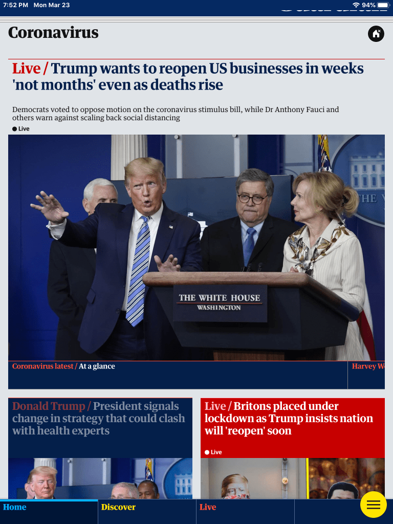 “In his White House coronavirus briefing, Donald Trump made clear that he wanted to lift restrictive public health measures as soon as possible, and that his major concern was the state of the US economy. He would re-open America for business in “weeks,” not months, Trump pledged, and refused to say whether he would simply ignore public health experts if they advised that restrictive measures to stop the spread of the virus needed to stay in place longer.”