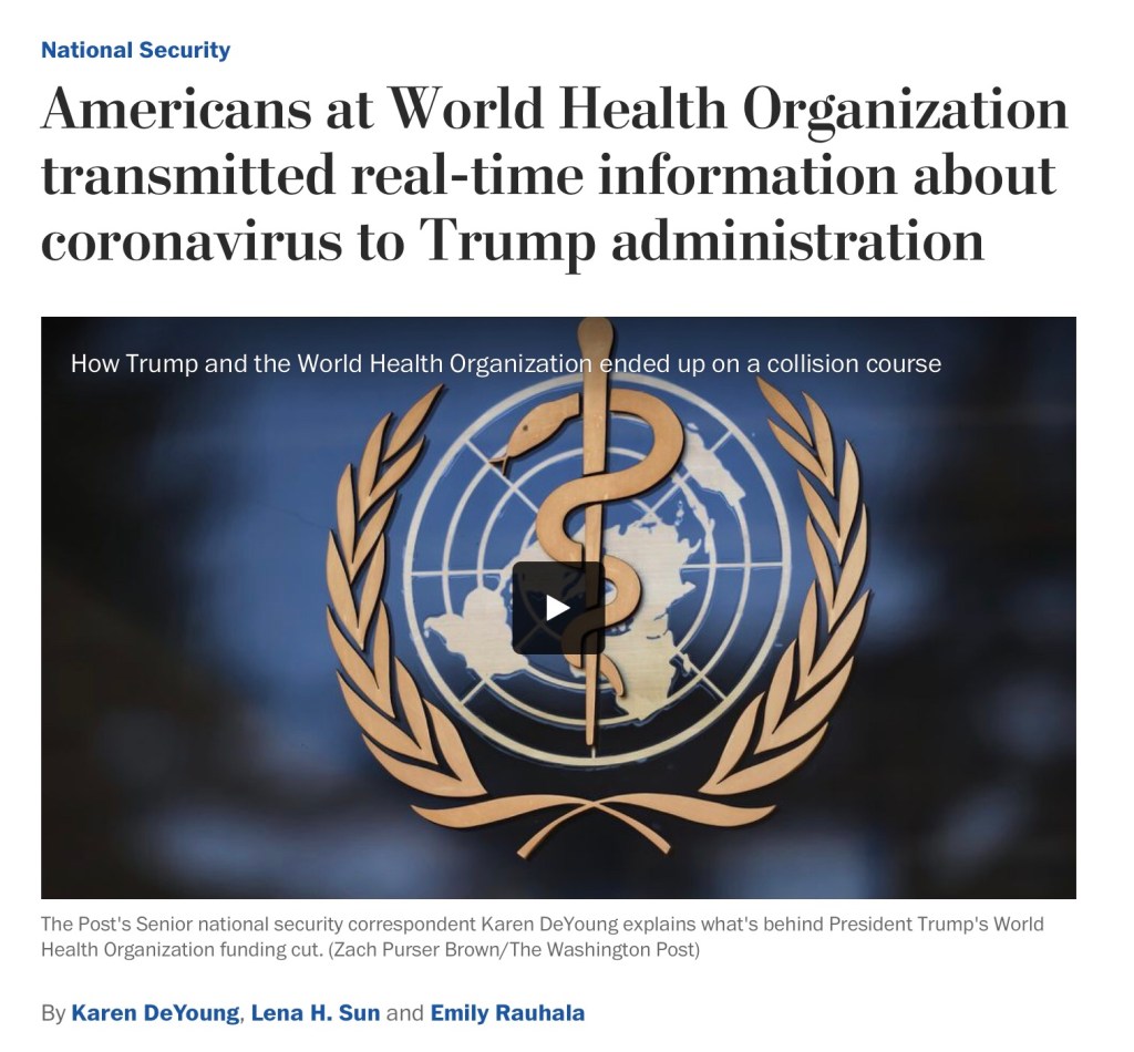 “Asked early Sunday about the presence of CDC and other officials at the WHO, and whether it was “fair to blame the WHO for covering up the spread of this virus,” Deborah Birx, the State Department expert who is part of the White House pandemic team, gently shifted the onus to China, and the need to “over-communicate.””
