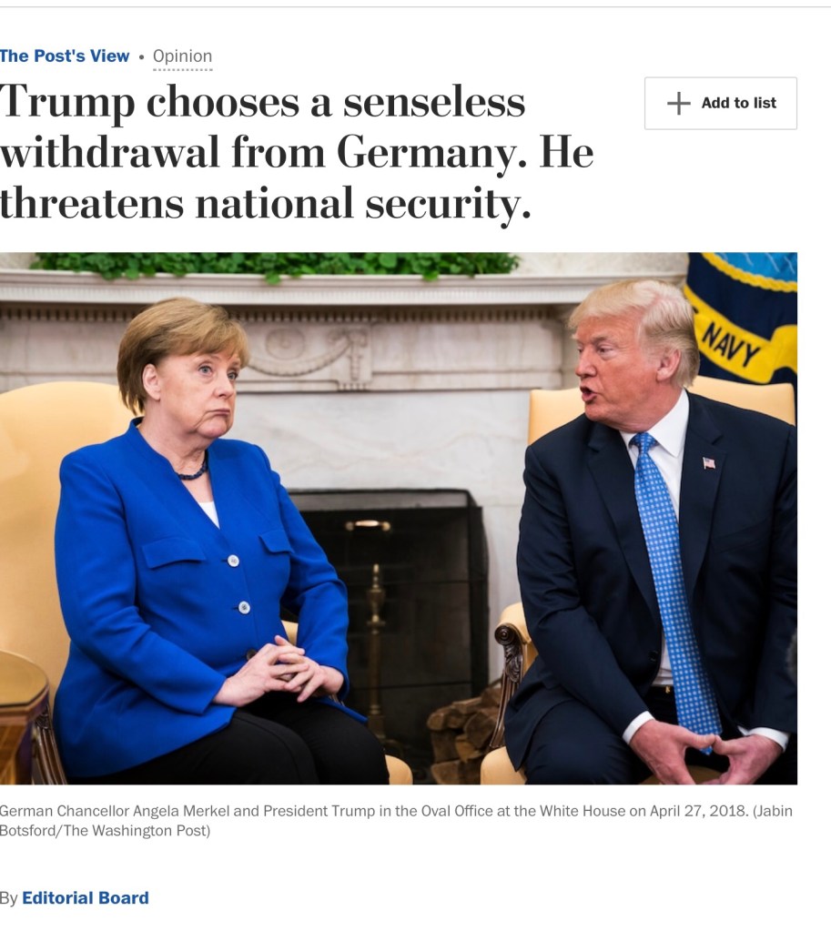 “Mr. Trump appears to believe he is punishing Ms. Merkel by removing forces that nominally defend Germany. The sycophant whom the president installed as ambassador to Germany, Richard Grenell, has been arguing publicly that Germany doesn’t merit U.S. bases when it fails to meet NATO defense spending guidelines. What he and the president fail to understand is that the 34,500 U.S. personnel in Germany — down from 235,000 during the Cold War — primarily bolster U.S. defense. The Ramstein Air Base is vital to operations in the Middle East and Africa, and the Landstuhl Regional Medical Center provides critical care to wounded American soldiers medevaced from Iraq and Afghanistan.”
