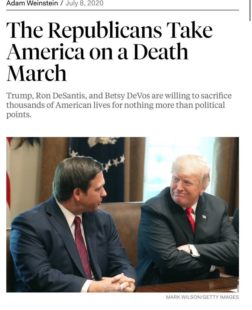 “Late last month, Carsyn Leigh Davis turned 17 in an intensive care unit bed in Naples, Florida. Two days later, at 1:06 p.m. on June 23, she died at a children’s hospital across the state, in Miami, where she’d been transferred for last-ditch “heroic efforts” at saving her life. She was the latest of 3,281 deaths in the state from Covid-19 at the time; as I write this, less than two weeks later, the toll is now 3,841.”