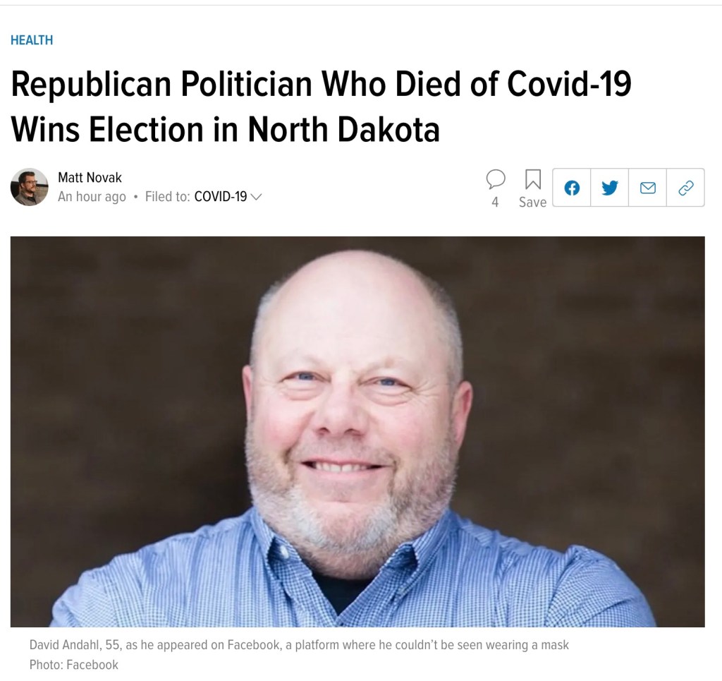“David Andahl, a Republican candidate for the North Dakota state legislature, won election on Tuesday, but the 55 year old won’t be taking office. Unfortunately, Andahl died of the coronavirus last month.”