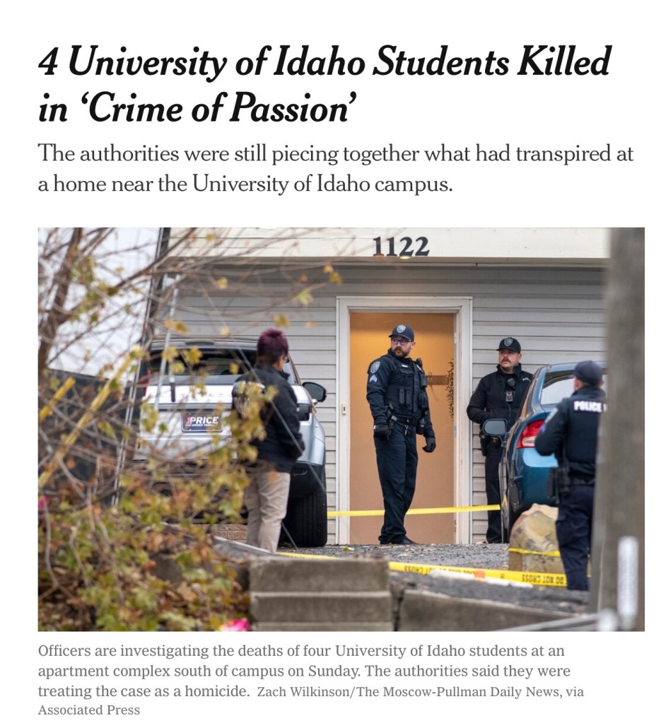 Addendum: Just announced (afternoon Nov. 15) that the U of Idaho killings were with a “bladed” weapon. Amended the above to refer only to the UVA shootings.