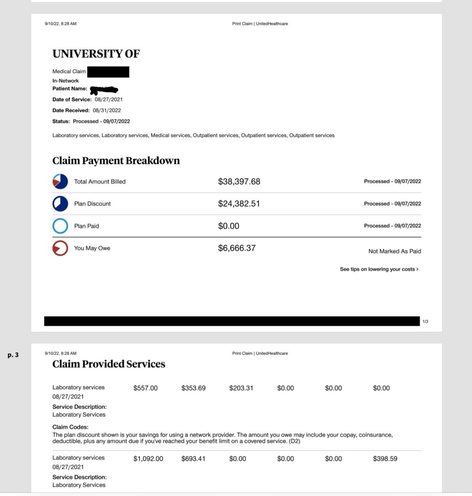 “Total Bill: $73,812 for the two shots ($35,414 for the first, $38,398 for the second), including lab work and physician charges. United Healthcare’s negotiated rate for the two shots plus associated fees was $27,568, of which the insurer paid $19,567. After Hinds haggled with the hospital and insurer for more than a year, his share of the bills was determined to be nearly $7,000.”