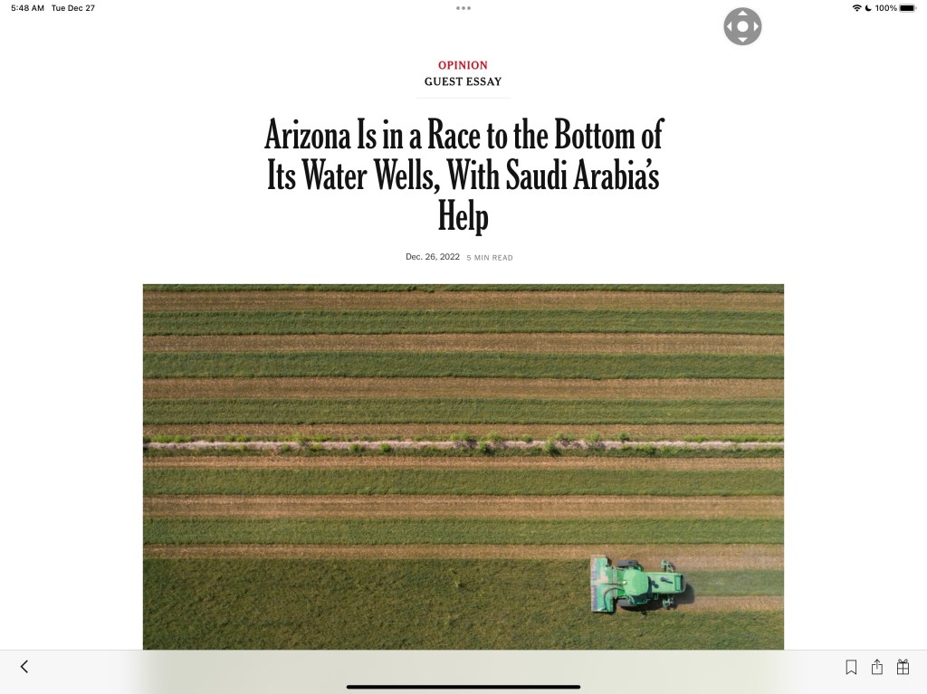 “Arizona’s water is running worryingly low. Amid the worst drought in more than a millennium, which has left communities across the state with barren wells, the state is depleting what remains of its precious groundwater. Much of it goes to private companies nearly free, including Saudi Arabia’s largest dairy company.”