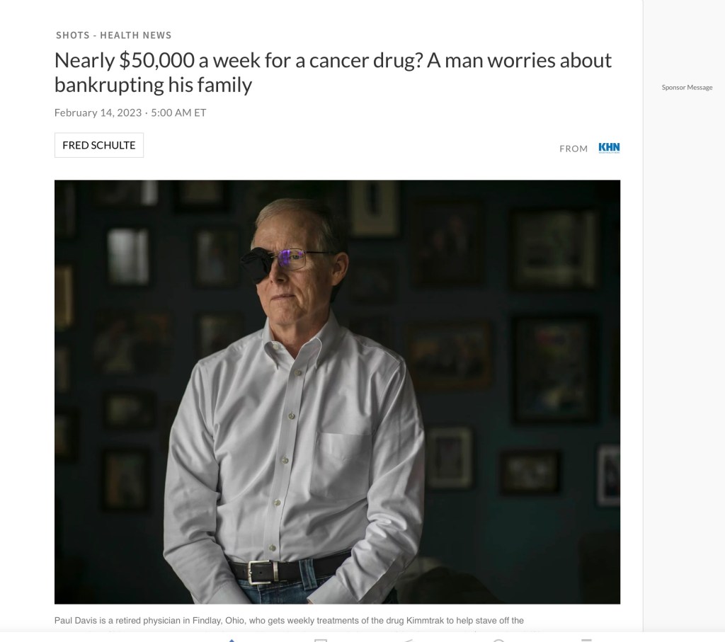 “Approved by the FDA in January 2022 as the “first and only” treatment for metastatic uveal melanoma, Kimmtrak has kept his tumors stable, according to Davis. His oncologist told him he should stay on the drug “until it stops working.” Its manufacturer markets the drug’s power to deliver “6-month improvement in median overall survival.””