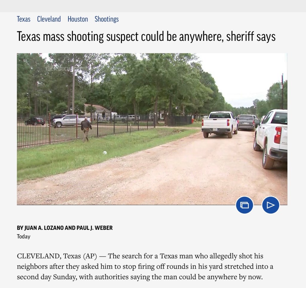Medicynical Note: A lovely Sunday in America. We lead the world in mass shootings, school shootings, accidental gun deaths, gun suicides, gun murders, police shootings, police getting shot, house party shootings, neighbor shootings and shootings of classmates and friends.The living hell of America in the 21st Century.